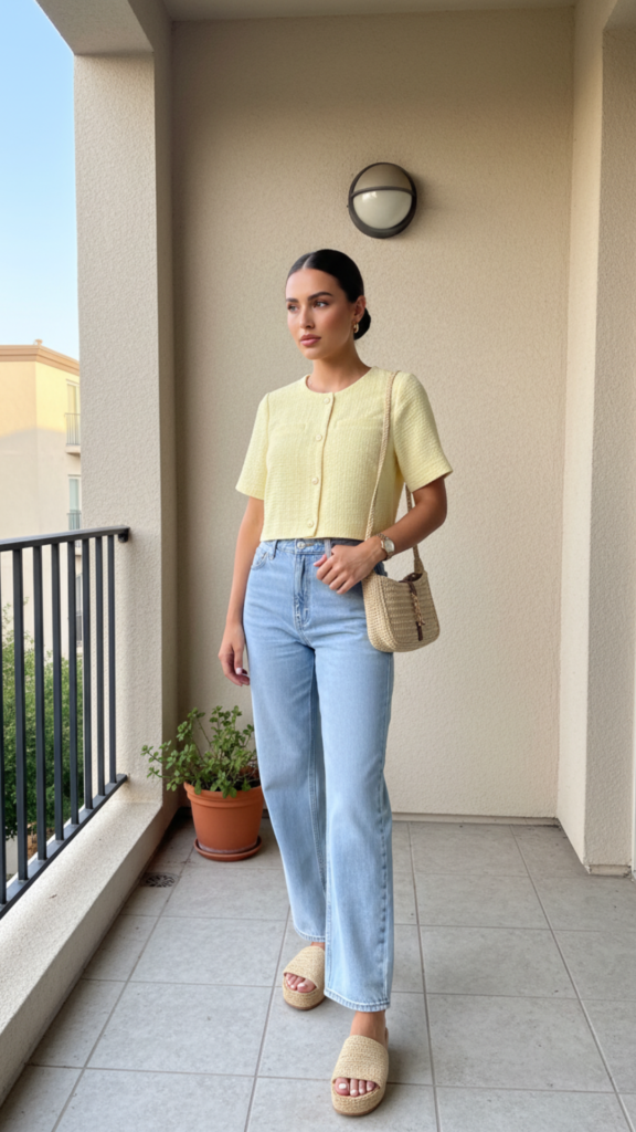 The soft yellow top brightens the look while keeping the palette light and fresh. Straight-leg denim adds structure, balancing the softness of the color. Paired with woven accessories, it creates a relaxed, warm-weather feel that still looks refined.
