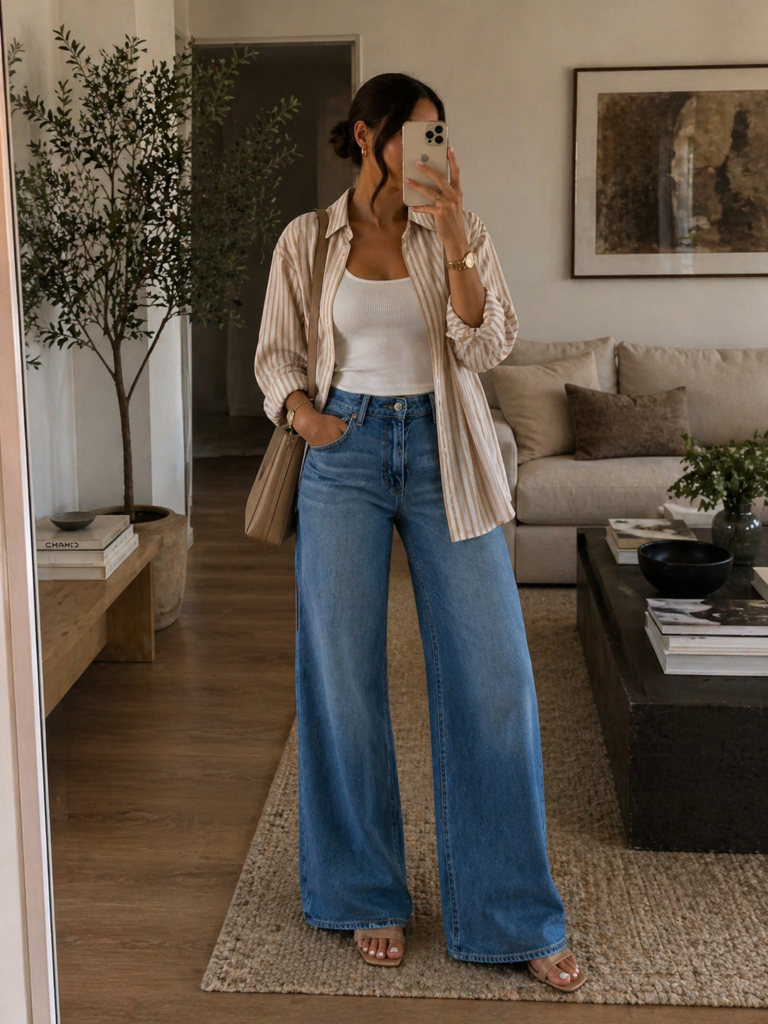 I love this look for how easy yet polished it feels. A simple white tank layered with a striped button-down and wide-leg jeans creates that relaxed, elevated balance without trying too hard.