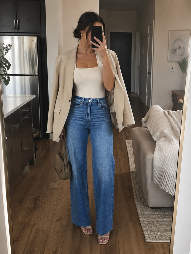 I always reach for a neutral blazer when I want to instantly elevate a simple jeans look. Paired with a fitted tank and classic straight-leg denim, it feels clean, balanced, and effortless. This is one of those outfits that always looks polished with minimal effort.