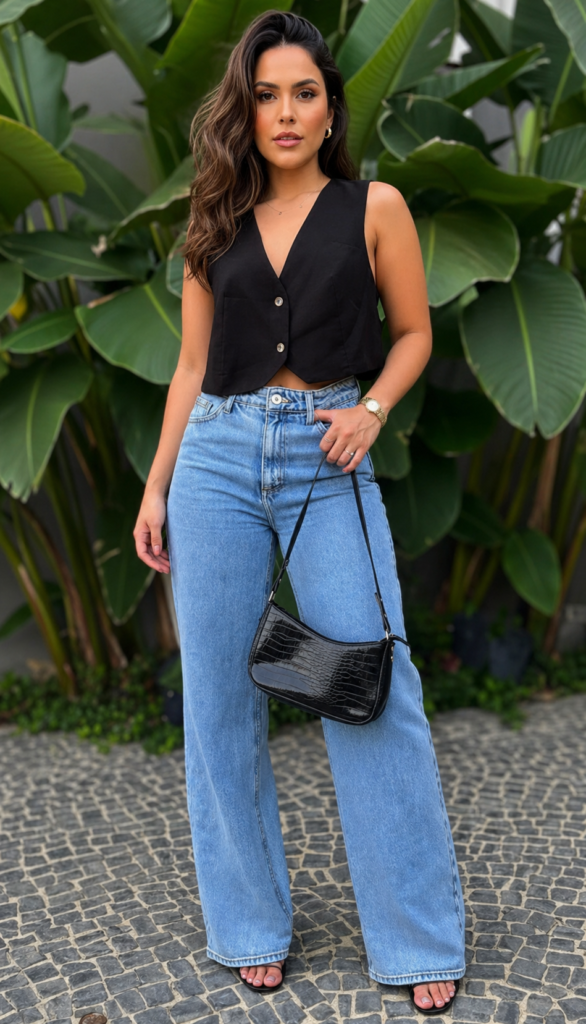 A monochrome palette sharpens the overall silhouette and keeps the look clean. The fitted top contrasts with the relaxed denim, creating a streamlined shape. Finished with pointed heels and a structured bag, the outfit reads polished and modern.