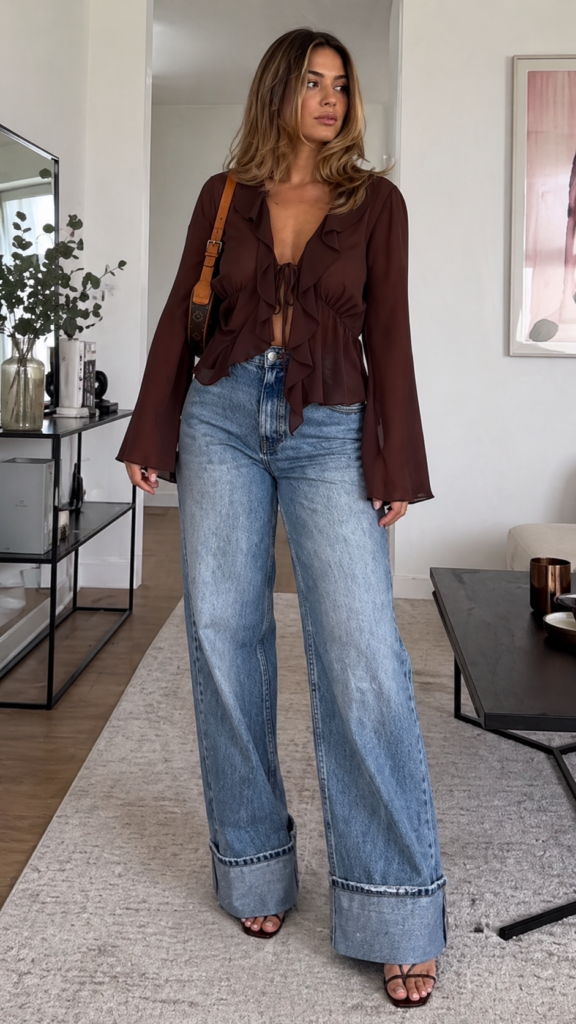The soft ruffle detail adds movement and contrast against structured denim. Wide-leg jeans ground the look, creating a balanced and modern silhouette. It’s a refined mix of feminine texture and relaxed tailoring that feels elevated without being overdone.