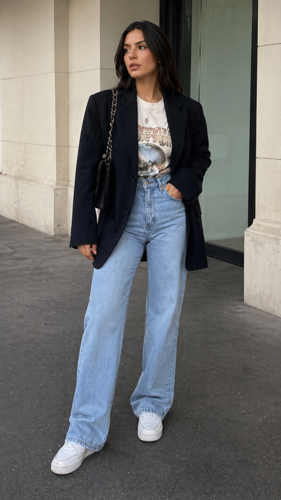 The structured blazer adds polish while the graphic tee keeps the look relaxed and current. Wide-leg denim softens the overall silhouette, creating a balanced mix of tailored and casual. Paired with sneakers, it feels effortless but still styled.