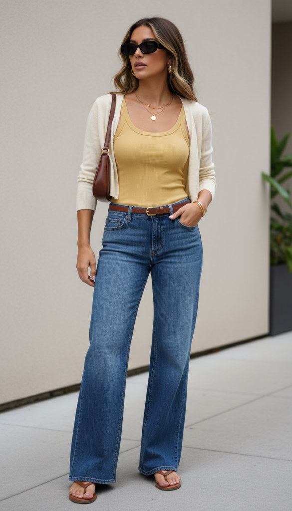 I love how adding a lightweight cardigan softens the look while still keeping it polished. The wide-leg jeans give it that relaxed, elevated feel without looking too casual. It’s an easy way to make denim feel more styled and intentional.