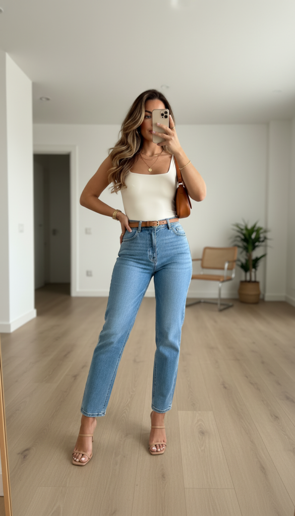 This is one of my go-to ways to keep denim looking clean and elevated. A simple fitted top paired with structured jeans creates a balanced, refined silhouette. It’s minimal, effortless, and always looks put-together.
